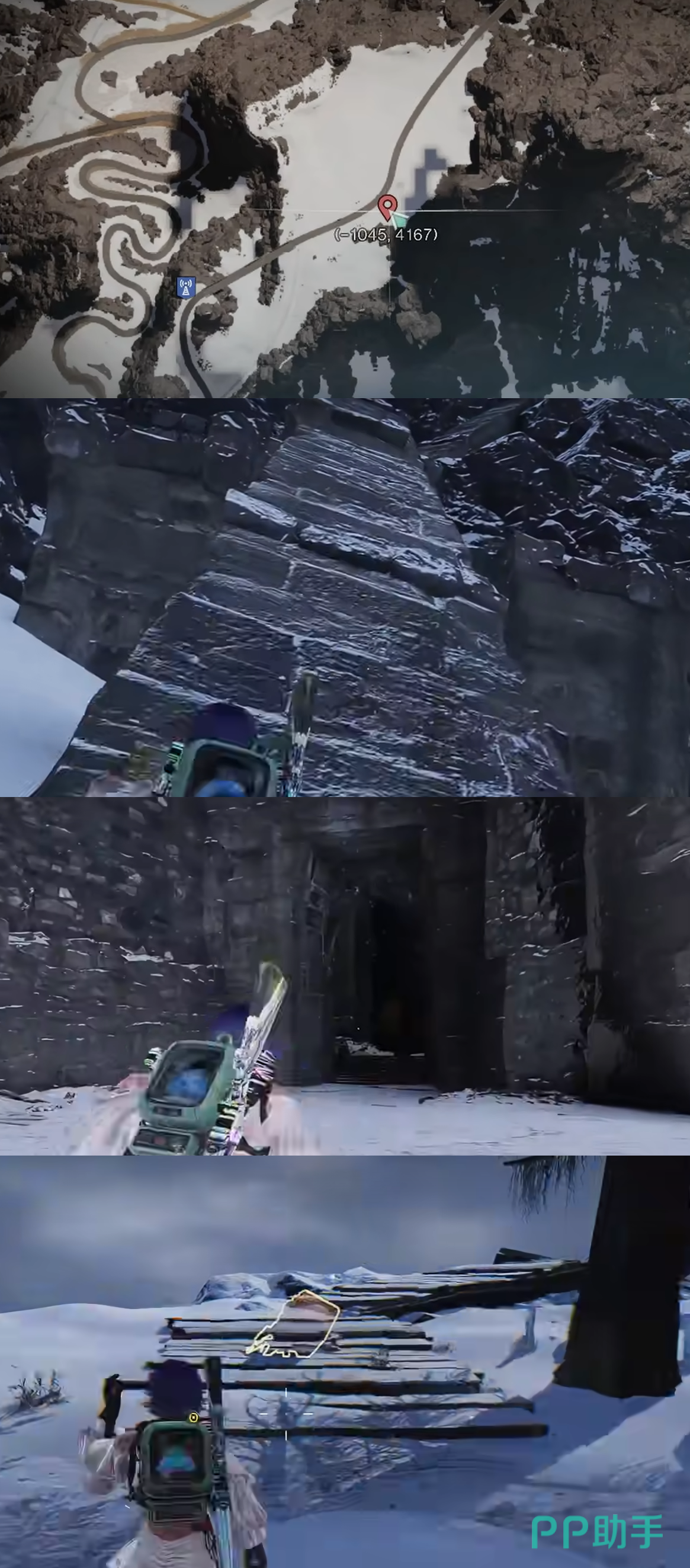 第6个拟态宝箱坐标(-548,4318),但在这之前先到(-1045,4167)的位置,到达马路该位置后下车朝着雪山上爬,这里有一条向着山上的位置,爬到山顶后从一处洞口进去,一直往里走,在一个出口处有一颗大树,那里就是拟态箱的位置,这个拟态宝箱是最难找的。