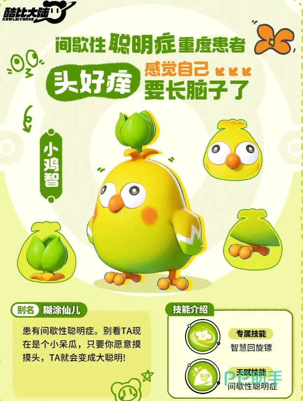 小鸡智从外表上看是只黄绿色相间的小鸡,头顶上会顶着像花苞一样的东西,日常眼神看着会给人呆呆傻傻的感觉,但抚摸完它后,头上的花苞就会开出聪明花,眼神也会给人一种非常聪明机智的感觉。