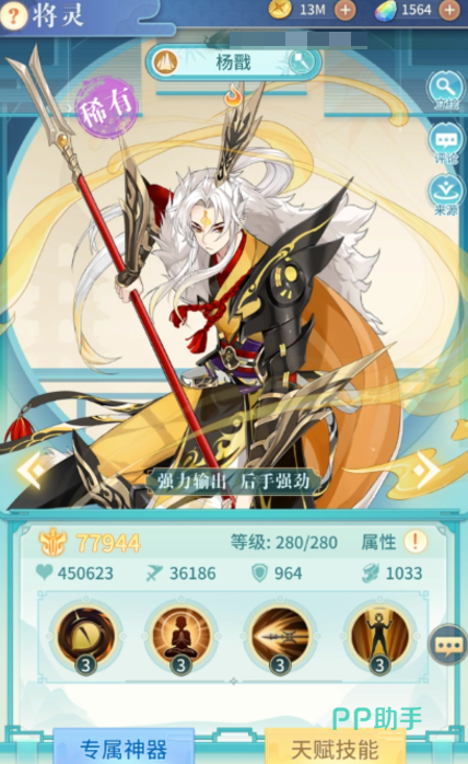 杨戬是游戏里的输出型的将灵,280级满级,可以提升到不同的星级,五星,六星,十星等,在不同星级时基础属性会随之提高,他的基础属性相当不错,攻击力达到了36186,生命值更是达到了惊人的450623,攻速也相当的可观。