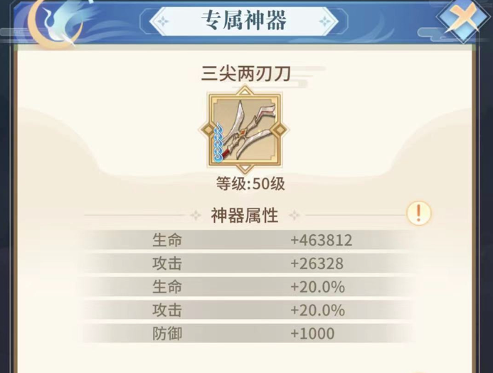 专属神器“三尖两刃刀”也有神器的专属技能,在战斗中爆伤减免增加8%,暴击伤害增加12%,自身每拥有1%暴击率获得1%暴击伤害,造成暴击时还能回复自身150%攻击等量生命值。