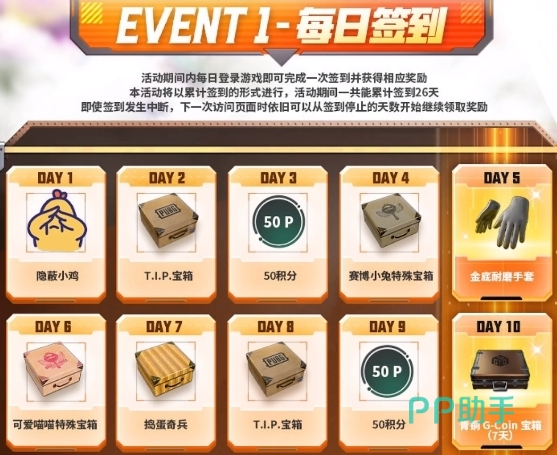 到时玩家只需在活动期间每日登录游戏并进行签到,即可收获不同的奖励,而这些奖励包括永久的道具金底耐磨手套、工作裤和工装夹克,同时还有青铜G-Coin宝箱等道具奖励,即便大家错过了签到,再次访问页面时也可从上次停截止的积累天数继续去领取对应的奖励,其中累积签到的天数还能额外解锁更多福利哦。
