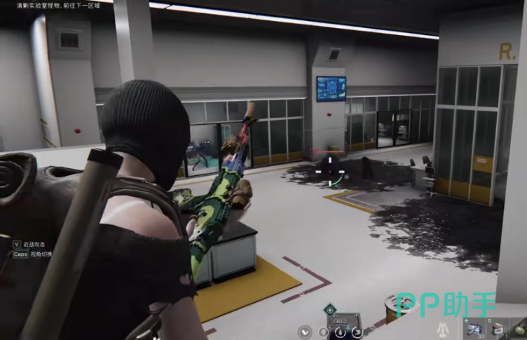 进入到第一个门禁位置时,大家可以直接登上比较高的实验台上面,这样占据高处有利地形的话能方便你更快的击杀怪物,全部击杀完小怪后会出现大的畸变怪,依然在高处扫射击杀即可,完毕后玻璃门就会开启并出现新畸变怪,注意先解决掉远程的那只。