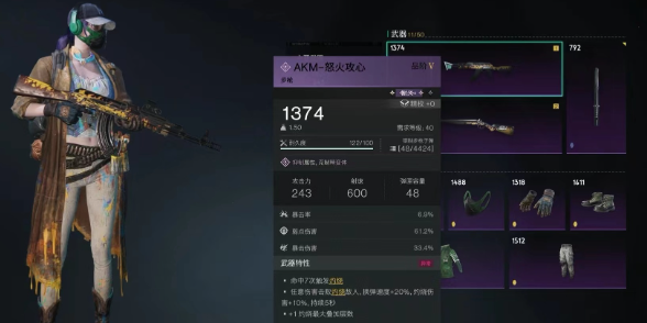 怒火攻心属于ak系列,它的初始攻击力有204,弹匣容量是40,射速为600,暴击率为6%,它的能力是在命中7次后,触发敌人灼烧状态,之后的任意只要命中就会提升射速和灼烧伤害,效果总共会持续5秒钟。