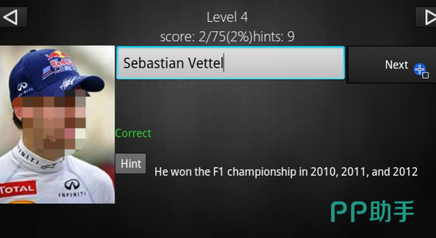 《人物测验》一共加入了两种精心构思的测验模式,每一种模式一下蕴含的人物类别都是大有区分的,娱乐界、赛车界等各具风格的人物类型供大家选用,玩家需要依据左侧人物的图片,在对话框输入正确的名字不断进行验证,每成功猜对一次挑战时间就会增加,每一个关卡中都有免费提醒功能帮助大家渡过难关。