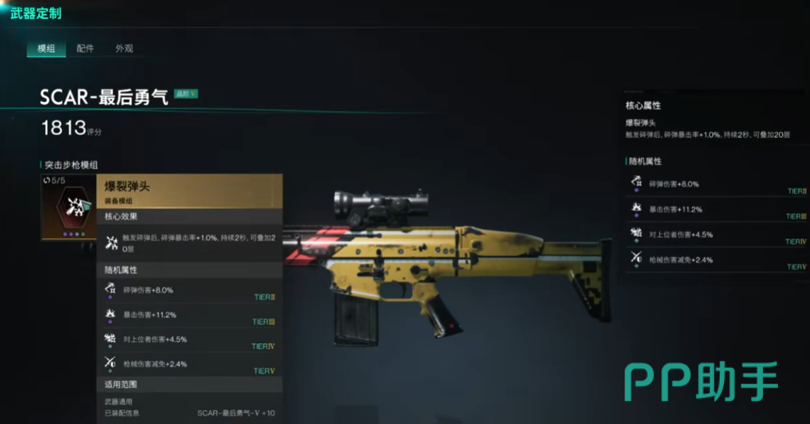 至于面罩的话,选择炸裂弹片更加合适;服装上的选择,可佩戴正面冲突。裤子最好使用暴击狂热,手套则可陪装备暴击强化。鞋子建议选择隔岸观火,毕竟我们用的是步枪,作为中远距离输出武器,价格亲民又合适。属性上优先选择爆伤、枪械伤害以及碎弹伤害,由于勇气这把武器特别吃模组加成,刷模组是一件颇为痛苦的事情,所以大家尽量勤奋一点,便能发挥出他应有的伤害。