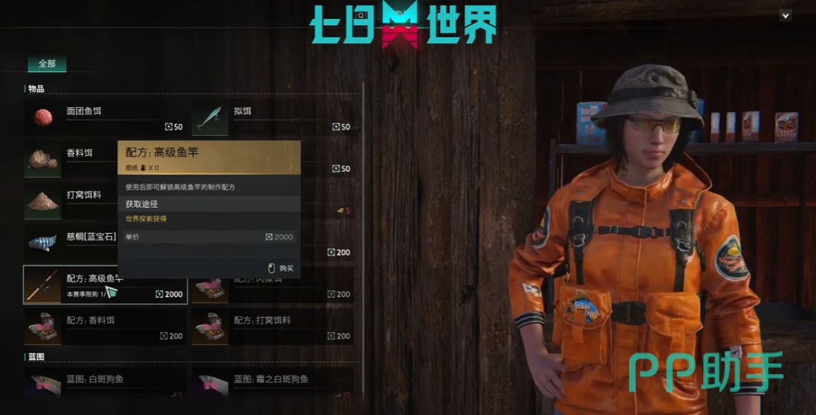 点击商店,打开后就可以看到各种关于钓鱼类的用品。我们直接往下拉就可以看到高级鱼竿配方图纸,需要花费2000点电池才可以购买。使用后即可解锁制作高级钓鱼竿的配方,除了购买之外,也可通过探索世界获取。