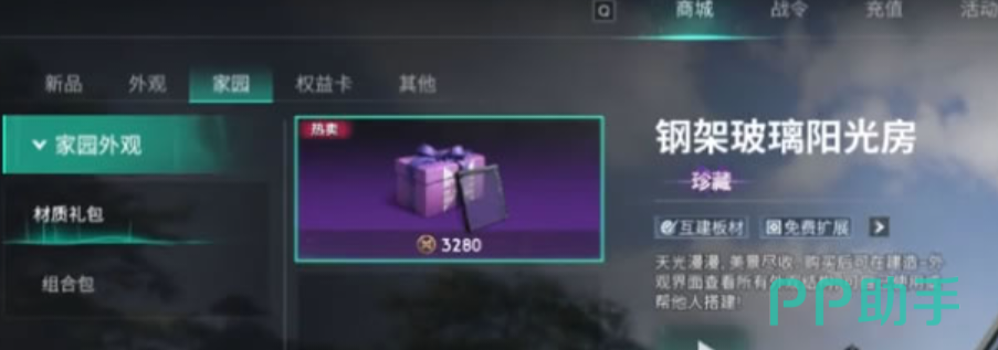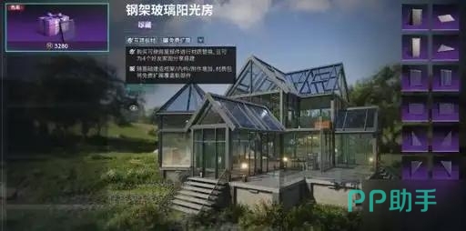 我们在商城里面所购买的钢架玻璃阳光房就是建造玻璃房时所需要到的玻璃墙了,这个材料是一整套材料,购买时需要玩家花费3280星源,虽然价钱有一些贵,可是买了它以后,我们在扩展玻璃房时,是不许挖坑在额外支付费用扩展的,值得大家注意的一点是,这套材料对使用人员没有任何的限制,我们可以买来自己使用,也可以给别人使用,最多一次性可以给4名玩家使用,这也就是说只要1位玩家购买了建筑材料,就可以给4个人建造玻璃房,这一点可以说游戏方做的还是比较贴心的,如果大家都喜欢玻璃房的话不如就拼单购买吧。