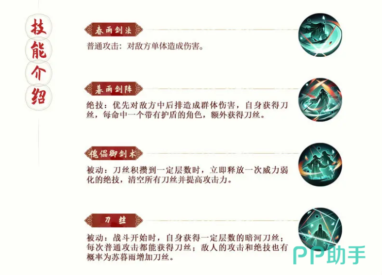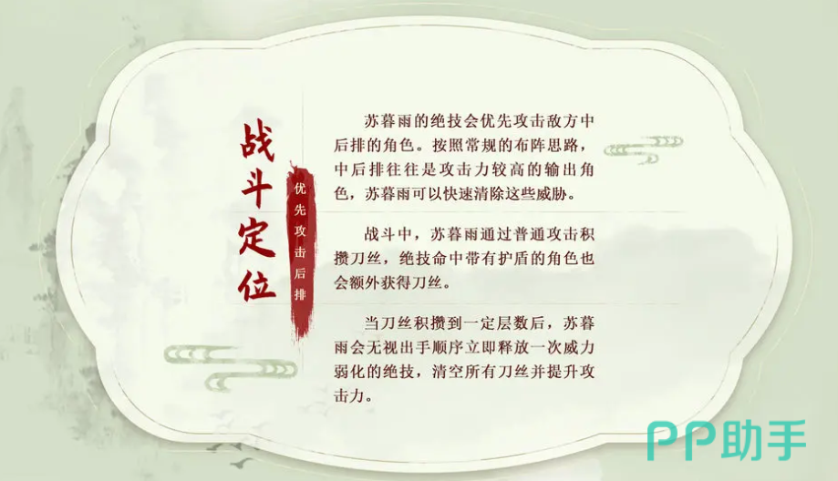 苏暮雨在本作中是一个兼具高爆发、高机动性和控制能力的优秀角色。在实战中,他能够迅速压低敌方血量,为队友创造输出机会。同时他的生存能力也是很给力的,能够在关键时刻为自己提供保护。通过合理的技能搭配和阵容组合,苏暮雨将成为你在游戏中驰骋江湖的最佳伙伴。