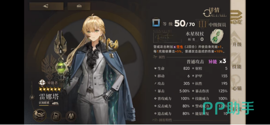 雷娜塔在游戏中的身份是一个中级探员,一个6星的异能者,她的警戒攻击可以给对手附加带电的效果,持续2个回合,并使自身充能一次,每一次充能则能让雷娜塔增加百分之五的暴击,普通攻击可以对对手造成百分之十的伤害,整体属性面板数值也不错,属于中等偏上一点点。