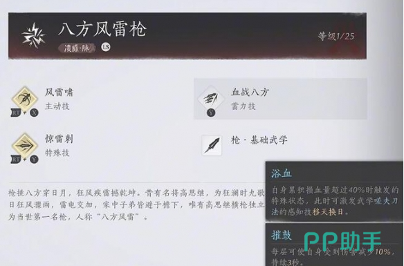 在成为门派中的其中一员之后,此时就可以获得装备九曲惊神枪和八方风雷枪。另外也可以学习到一些对应的武学技能。例如风雷啸可以嘲讽附近的敌人,而且还可以造成少量的伤害,自己可以得到短时间的霸体以及治疗时,以当前血量的80%作为基础,每一次损失8%就可以获得一层效果,最多可以叠加5层。