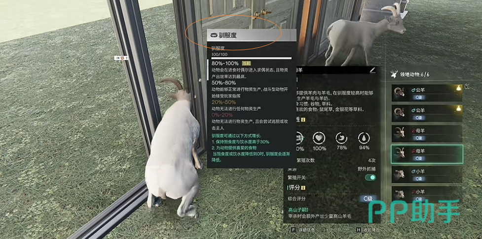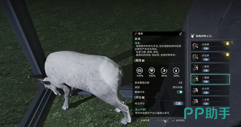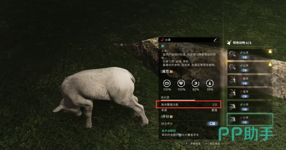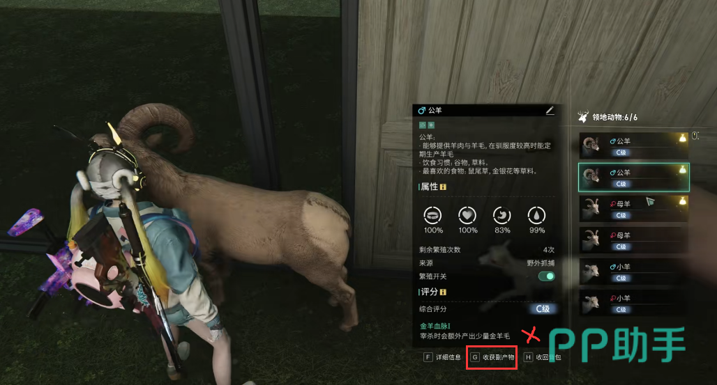 因此,假如你想稳定地繁殖出来C级的金羊后代,那么就需要选择C级的金羊血脉的母羊+公羊,繁殖出来的必定是带C级的金羊血脉的小羊。如果是金羊血脉的公羊+高山子嗣的母羊,也会有很大概率繁殖出来金羊血脉。只是目前有一个bug,那就是有的小羊养不大,它无法“收获副产品”,完全没有这个选项。好在小羊长大以后依旧有“繁殖开关”,玩家还是可以照旧进行繁育的。利益最大化的考虑,就是把那些没有繁殖次数的公羊和小羊宰杀,一样可以收获到金羊毛。注意,金羊血脉的母羊就不要宰杀了,我们可以留着它繁育下一代。如果你有耐心,也可以等待官方注意到这个bug,等待版本更新修复。