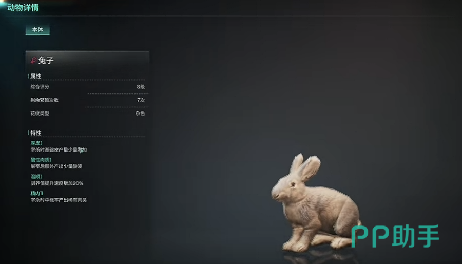 简单地说,你想要金羊毛,就去找拥有金羊血脉的羊;想要高山羊毛,就找对应的拥有高山子嗣的羊。因此,你可以多尝试抓多一些不同的动物,可以在捕捉它的时候直接查看该动物身上的词条。举个例子,假如你抓获一只兔子,可以按shift键直接查看其详细信息。也就是说,你把它养大了以后,特性什么的都是固定的。因此建议玩家多抓不同的动物,然后一一查看它的词条,再从中筛选出坏的、不好的直接丢掉。当然了,你也可以选择将其带回家宰杀,获取基础的毛皮,根据你想要的毛皮去找对应的词条就对了。