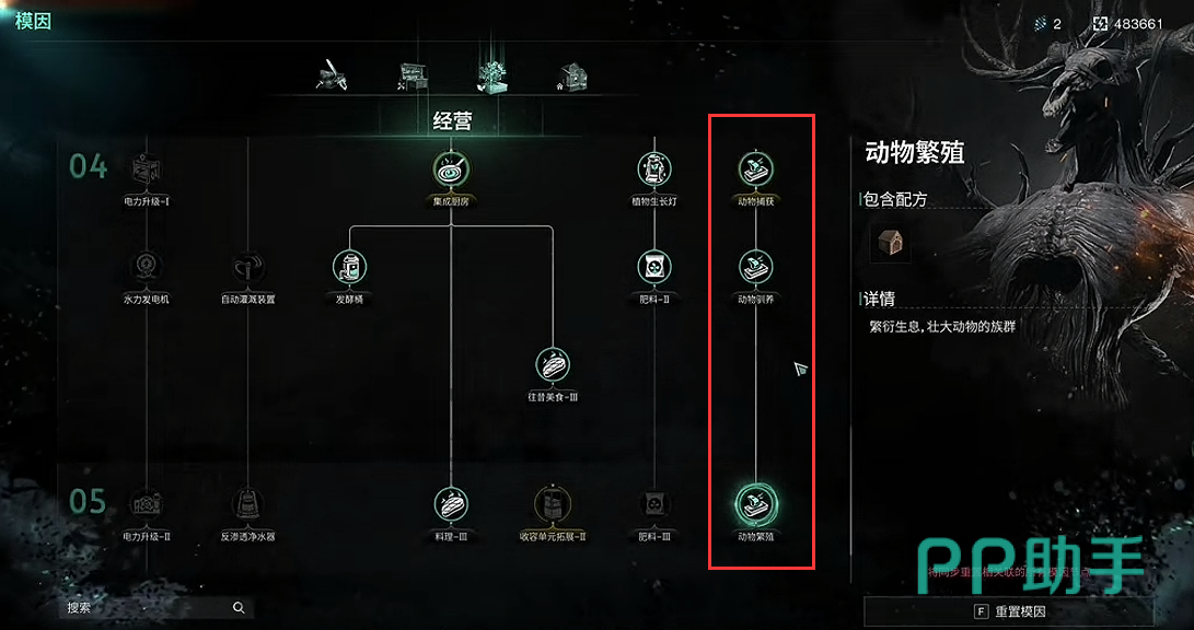接下来小编要给大家介绍一下如何养殖动物。第一点就是“抓”,我们需要在模因经营里面找到第四阶段的“动物捕获-动物驯养-动物繁殖”;虽说这是第二阶段才能做的事情,不过在第一阶段我们做不出来麻醉、飞针之类的道具,抓起来比较麻烦,并且没有饲养槽、饲料等,相对来说比较麻烦;但是我们可以在第二阶段将它们点出来,包括动物的幼崽小屋等。