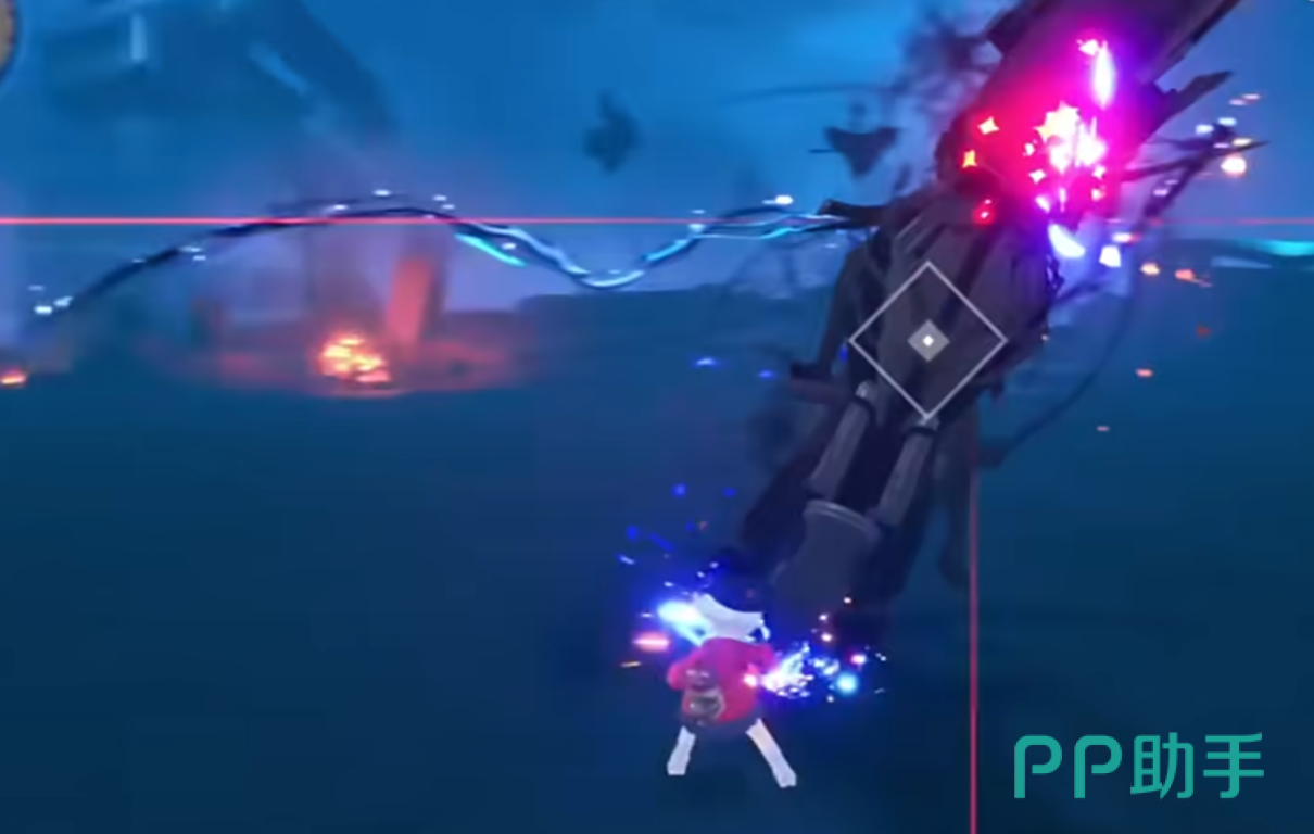 刚开始boss到了血量非常厚,多达15条。然后护盾值也高,所以最好的打法便是破盾。破盾也很简单,只需要带一个克制它的属性的角色。例如他是火属性,所以我们最好带一个冰或者水角色。破盾完之后,打起来相对轻松一些。然后他的身躯较高,所以尽量往上打,才不容易空掉技能。