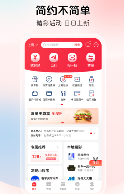 安全又简洁的便捷支付平台,付款码、扫一扫、安全支付应有尽有,每次支付笔笔都有优惠。同时也有保险功能,小伙伴们选择保险后,支付过程中的流程及支付后的危险,都是保险公司来承担。除了补贴的支付模式外,还有理财板块,可将自己的闲置资金放到其中,完成理财。不过有很多理财产品,一定要谨慎购买。