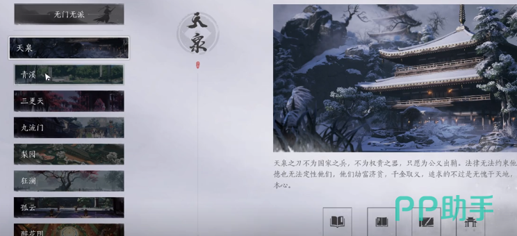 天泉派:武器主要是陌刀,定位于肉盾。门规的特点是守律值,每一周可以免责违反一次,如果加入的话就需要将两个九流门派人员砍杀,另外还需要和张一豪对话。门派武学还是比较多的,其中包括可以造成伤害的虎啸龙吟。