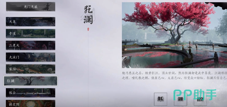 狂澜派:主要的武器是长枪,追求的是自由,还有力量。是门派的规则,每天参与头胡玩法就可以获得奖励。风雷啸还可以嘲讽敌人,并且得到治疗的效果以及霸体的效果。