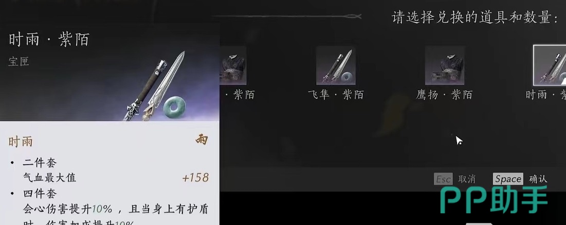 时雨是一套只有在护盾情况下才可以激活伤害加成的套装,两件套的时候可以增强我们的气血,集齐四件套时,伤害加成可以提升10%,若是自己的身上套有防护盾时,伤害加成也会提升10%,值得注意的是只要集齐了时雨套装,等套装到了55级就可以获得一件紫陌装备。