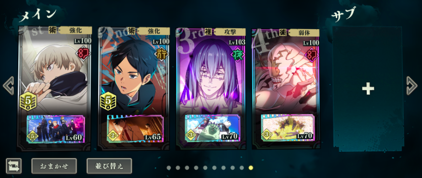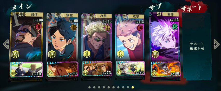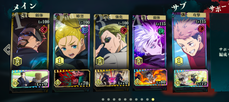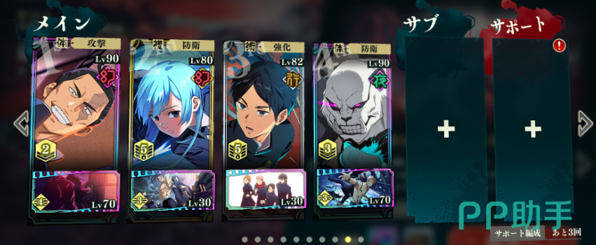 第二个是非常适合一些“躺平族”去使用的自动战斗队模板。一般这个模板的标配首先是要看辅助型角色自动战斗时所释放技能的情况,目前在整个卡牌当中依旧是一额正道,这个角色比较好用,因为他优先释放的二技能可以实现增伤buff,而随着卡池的更新,硝子和伏黑惠这两个角色同样非常好用,尤其是硝子能够优先使我方的重力进行回复,这样的话就非常适合搭配一些咒力消耗大的输出型角色,而其他配伍队员可以根据敌方的属性克制关系来决定上场次序。目前比较好用的组队模式是夜蛾正道,搭配硝子,七海建人,虎杖悠人和五条悟。