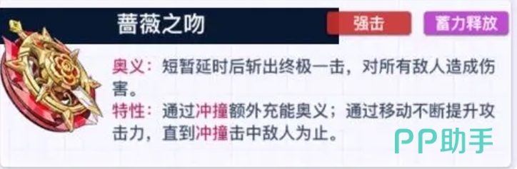 露丝忠于与陀螺手之间的契约,所以称号也被叫做蔷薇之吻,蔷薇之吻的奥义技能不仅仅是一次攻击,在这个技能激活后,经过三秒的紧张蓄力,这片战场上将绽放出一朵毁灭之花,对所有敌对单位施以相当于自身攻击力300%的打击,破坏力堪比爆炸效果,只要使用瞬间改变战场格局,当然如果对面有打断效果的话,需要大家精准捕捉敌方集群或不稳的时刻,使用这个大招才会达到理想的效果。