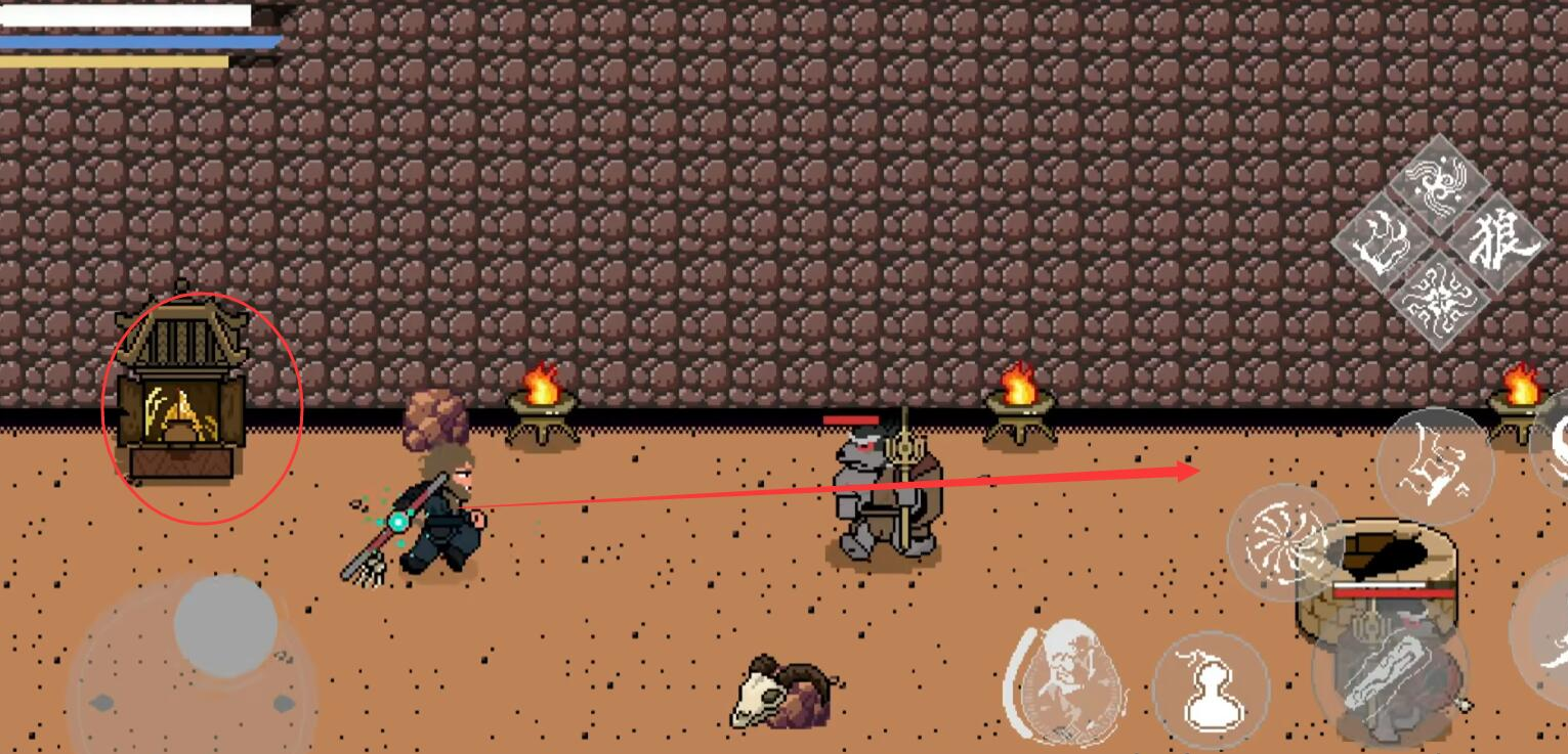 战胜他之后往回走。这时要注意往前面的时候房顶上的怪会放箭,通过消耗黄条可以反弹回去将怪击杀,然后一直来到土地庙前。接下来继续往前走和灵吉菩萨对话,这时能学会分身术,往回走进寺庙中,左边会有放箭的怪物,优先把这些怪击杀掉。然后找个打坐点恢复血量。