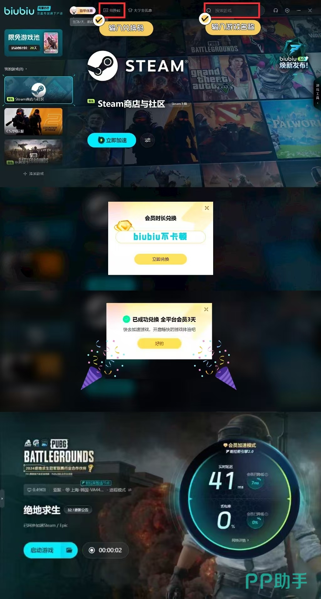 为了优化游戏体验,推荐使用 biubiu加速器,为新用户提供免费加速24小时的服务。同时,新老用户还可输入兑换码biubiu不卡顿领取3天免费加速,极大改善游戏时的网络稳定性。流畅的运行速度和无延迟的操作将助你在战场上更胜一筹。