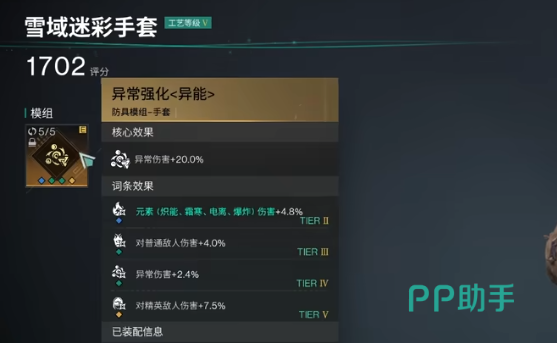 裤子选黑石裤子,裤子的模组选精准充能,这个效果能让上一个弹匣的弱点命中率每有10%,元素伤害就加4%,最高能提升到24%,手套选雪域迷彩手套,模组选异常强化或元素强化。