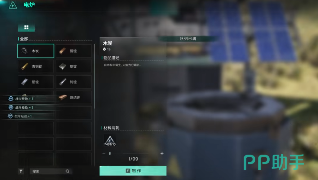 永恒岛的制作也同样可以获得战令,那我们就利用这个。可以看见永恒制作的物质只需要用到永恒之沙。这里我们推荐制作木炭,因为它消耗的时间很短,并且制作价格相当便宜。一次性可以连续制作99个,不过不管是做一个还是一组,都只能获得一点战令。