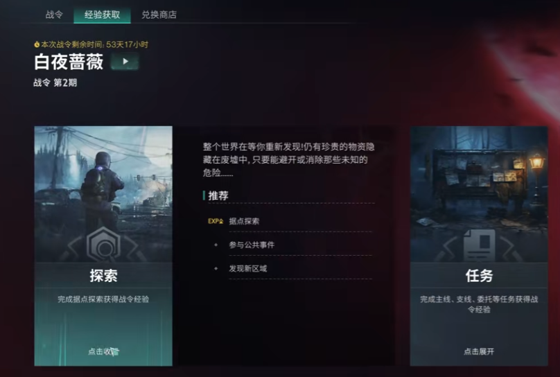 除了做任务外,我们也可以探索据点就能获得战令经验。不过这些地方可能存在未知的危险,只要注意规避好就行。例如发现新的区域,又或者参与公共事件并将其解决。这时前往新的收容所里自由寻找宝箱后,就能刷满探险度。