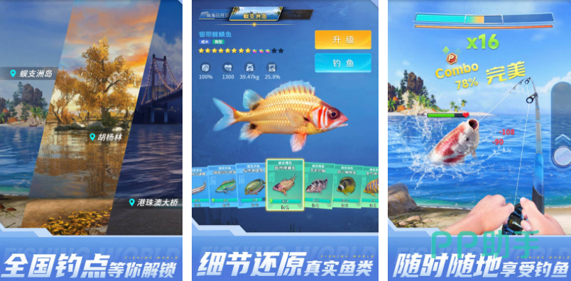 钓鱼世界是款内容超多的写实风格3D画面垂钓类型游戏,游戏为玩家打造的钓鱼场景景色宜人且海洋生物众多,真实的垂钓流程和背景渲染让许多垂钓高手乐在其中,非常真实的钓鱼手感、3D建模也为这款垂钓类游戏加分不少,第一视角的加持更给玩家带来了身临其境的奇妙体验,有事没事甩一杆钓钓鱼会轻松消磨无聊时光哟。