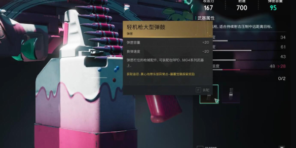 开启藤蔓宝箱轻机枪的大弹鼓在手。这件物品一安装,机枪载弹量就直接增加了20发弹,火力也大大增加了。然而这一附件并非无懈可击,它将换弹速度略微减低。玩家们在战斗中要多加留意,装子弹的时候要努力寻找掩体或事先收拾身边的威胁,不要让丧尸借机围剿。