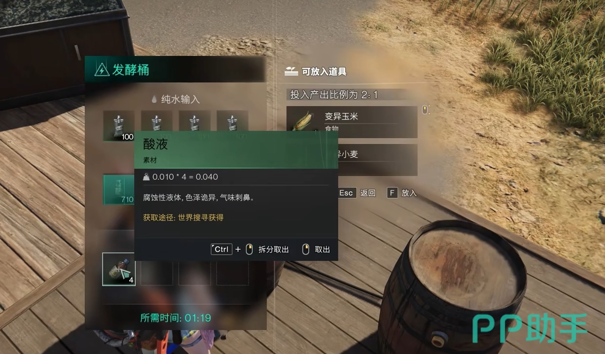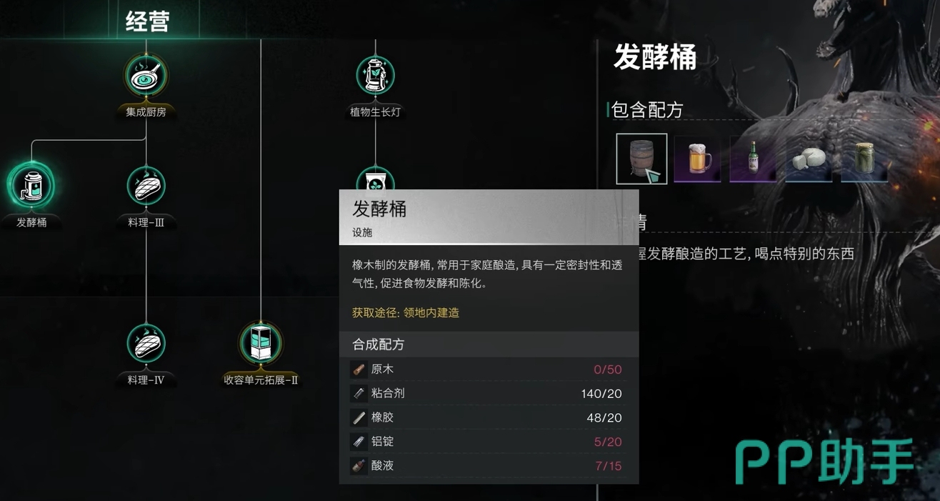 在专精中人们可点出硫磺化工,这样就能用硫磺和电池来转换出酸液了。此外,人们还可经营专精中点出发酵桶,它是人们获取酸液的主力,只要把酸混合液放入发酵桶里,就能源源不断地产生酸液供玩家们去使用了。