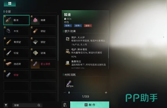 小油的日产量极限可达4320个,虽然这很难达到,但一般玩家日均收获约3000个小油是较为常见的,这意味着每天可以产出大约1万个源质,至于星尘矿的采集,则需要一些技巧,其实有玩家发现使用特定的工具,比如一个罐头,耗时45分钟就可以高效地采集到2万个矿石,硫磺化工也是需要的,通过这个专精,玩家可以用5个硫磺加上50个电池来制造出1份酸。
