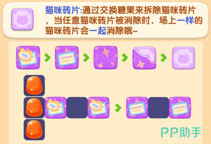 在消除的期间,玩家不仅能够获得更多的游戏积分,还能够通过消除来碰碎猫咪砖片,猫咪砖片在游戏当中可以通过交换糖果的方式进行移除,而游戏的关卡模式内,有大量的猫咪砖块需要玩家消除。
