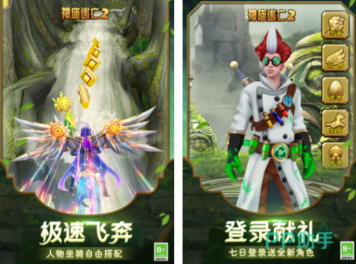 相对于普通的跑酷游戏这款融入了写实风格,仿佛真的在神庙逃亡的过程中会置身于危险的场景在看到了障碍的时候利用跳跃的方式就可帮助自己顺利的继续下去,利用极速飞奔的方式一路吃金币。要说它比第1个版本值得大家体验的地方就是有了全新的角色,还有炫目的其他场景,跑酷的过程中还可以骑着自己的坐骑。