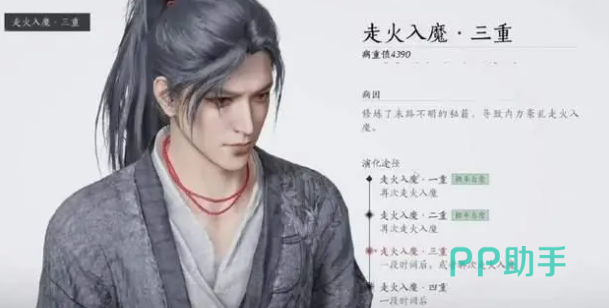 走火入魔会慢慢递增,以重来命名,点击角色状态即可查看,前面一到两重程度都比较轻,等待一段时间后就会自行痊愈,如果在第三阶段的话就需要医治,有三种不同的方法。