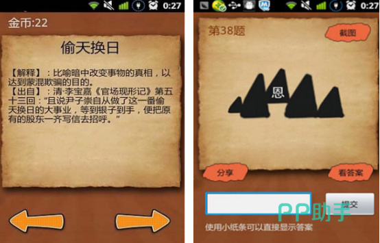 相对于只是以文字为主的,这款具有丰富的题库,虽然只是占有内存非常小的游戏,却蕴含着大智慧。无论你是想要知道,到底出自哪里或者是怎样的含义,这里都有相关的解释以及出处,如果玩腻了接龙这一种玩法,不如体验一下,看图猜成语。大家可以通过显示的文字,然后写出相应的答案,只要能正确的填写答案就能开始下一个题目。