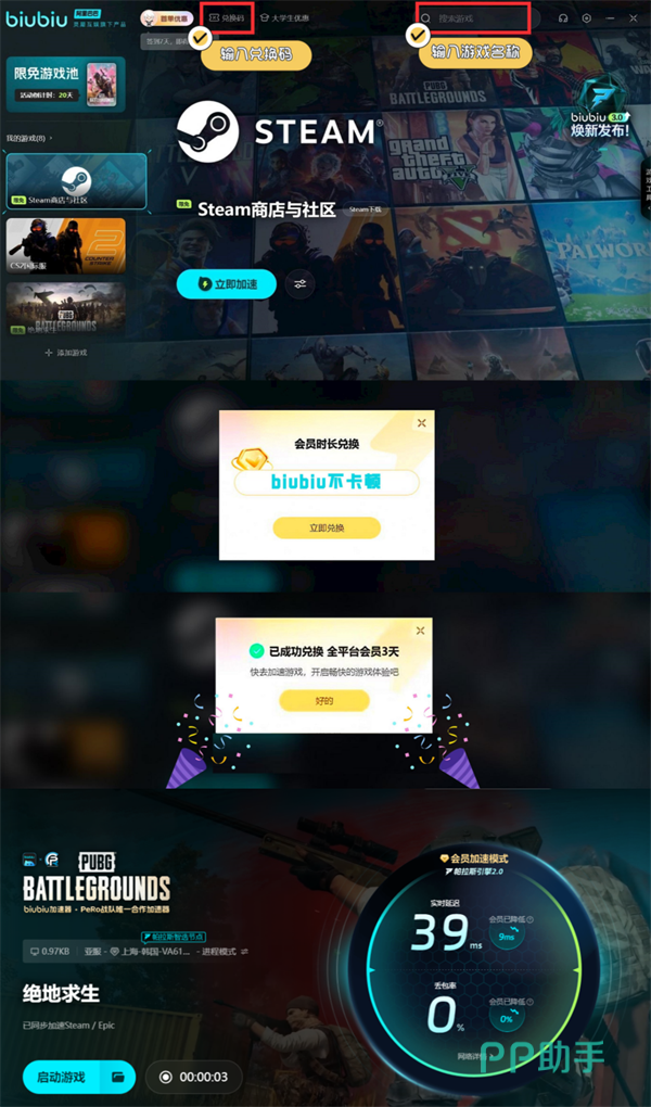 届时,所有平台用户均可输入“biubiu不卡顿”来兑换72小时的加速时间,特别对于新用户来说,总共可以获得3+1天的加速服务。