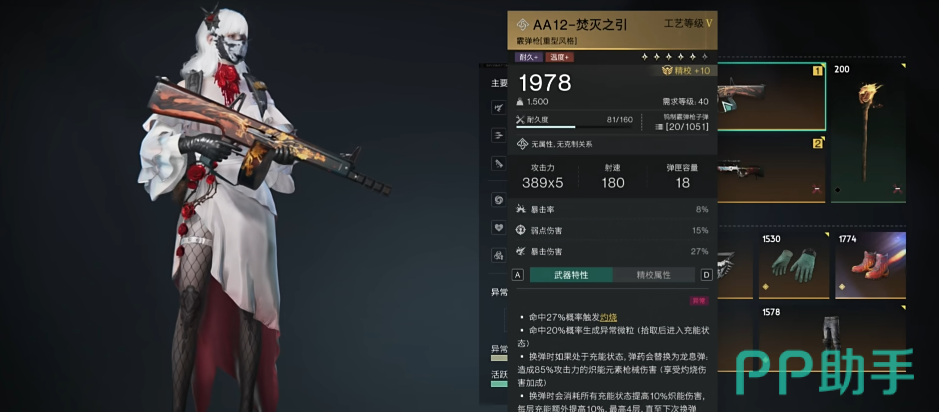 首先这个武器的攻击力高达2000点,暴击率高,能打出高额爆发伤害,因此大家一定要注重这个武器的高暴击效果。同时这个武器在击中敌人后有概率触发灼烧效果,生成异常微粒,助玩家快速充能。