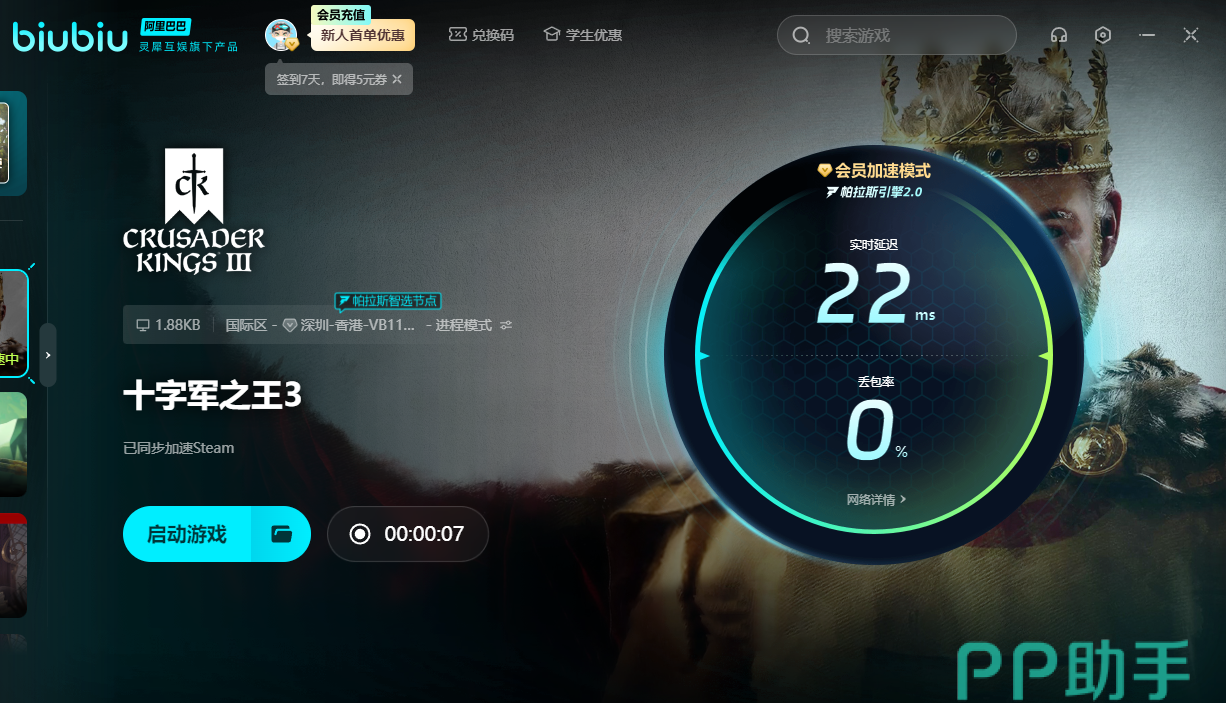 十字军之王3作为国际知名大作,尚未开始推出国服。所以打算进阶十字军中的统治者,就得用上biubiu。加速过后才能跨越几个世纪,让你来到新的家族或者国度中。新用户的话可以领取24小时的免费加速,另外新老用户输入【biubiu不卡顿】,就能额外获得三天免费加速。如果在发展途中太卡,就会限制你的扩张速度。使用加速器后,就能避免卡顿,能够无限制的扩张。要是与人开战时延迟过高,就无法及时做出周全的准备。有了加速器后,就能降低延迟,及时做好各种准备。