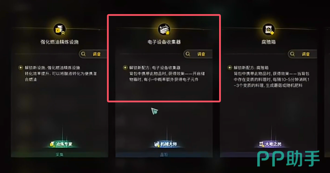 此外在战斗中打boss就能获得部分素材,例如最多的刷大师树妖可以稳定产出数十个电子元件,每日记得去刷新,在镇子里的战利品宝箱中还可以开到金色品质的电子元件,这点就看手气如何了。平时的开宝箱中也需要注意收集,不要直接丢弃或者随意使用,后期加工台升级等级后还可以试着将白色品质的电子元件加工升级为更高品质。