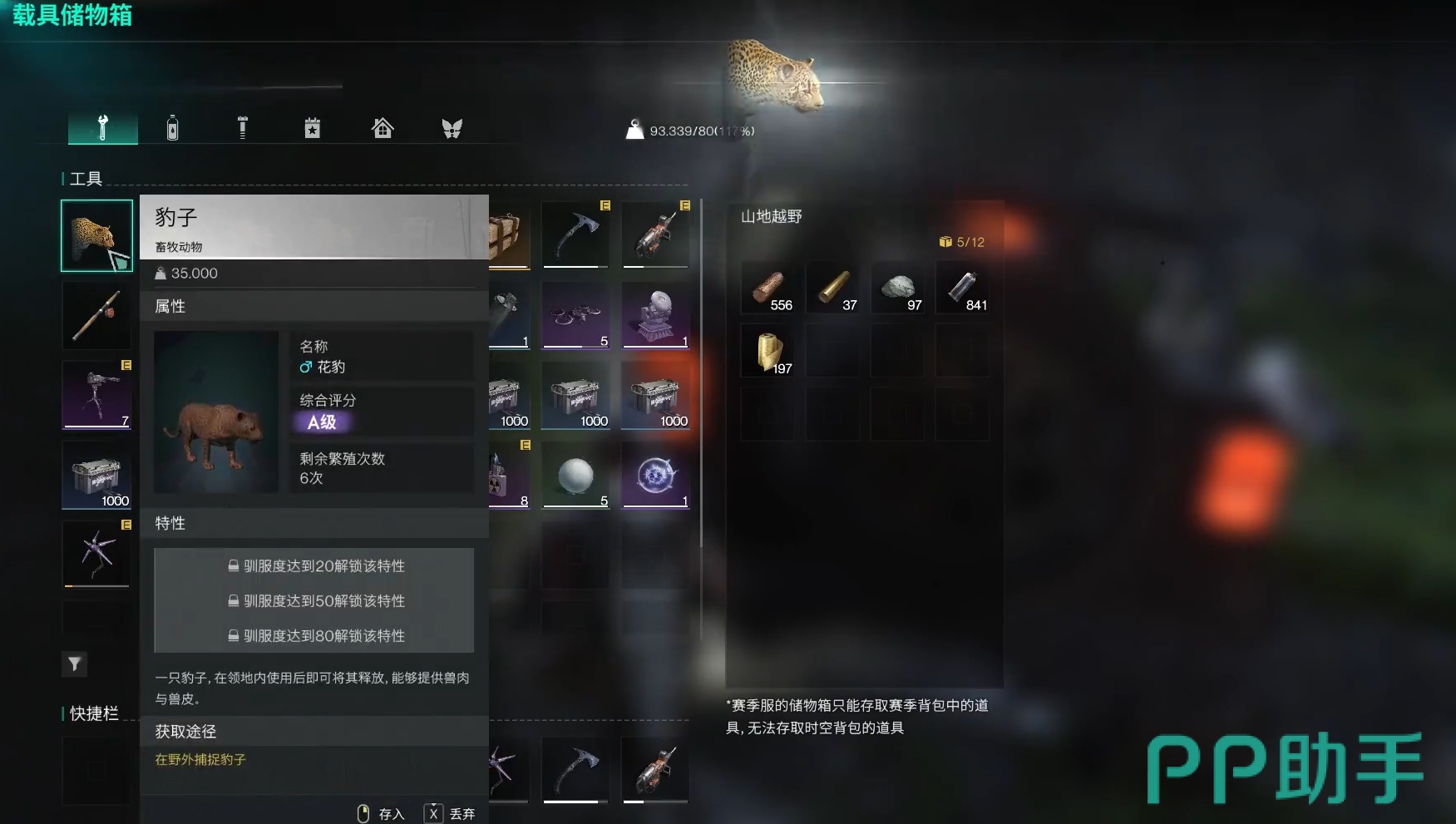 豹子是会主动向角色攻击的动物,因而在捕捉时得穿好装备规避翻车风险,还要拿上可让眩晕或麻醉的道具,例如幽光蘑菇罐头,有条件的最好开上吉普车去抓豹子,等抓好后可将豹子放在吉普车的后备箱里节约背包空间,这样就能利用进入永恒岛的方式来快速刷出豹子重复捕捉。