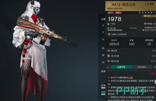 第二把武器装备狂推AA12焚灭之隐,作为一把长机枪武器,不仅有着非常不错的暴击指数,而且在弱点伤害的加成上也是非常不错的。当其子弹命中敌人时可发生大片灼烧,并且还可通过异常微粒的拾取完成充能。在充能完毕以后进行弹药的替换,可直接将普通子弹变成为龙吸子弹,在换弹消耗方面可以使所有的充能提升并且完成高灼伤伤害,整体来看,这把枪支的输出上限非常之高,不过在输出环境要求上是有一些苛刻的,对于喜欢贴脸开大的玩家可以尝试养成,综合来看也是在T0阶。