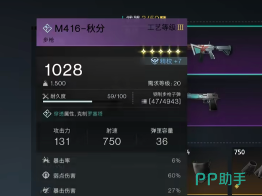 第四把武器推荐是m416秋分,作为一款耐久度非常不错的步枪,同样可以让玩家们在游戏当中有着非常不错的发挥,这款紫色枪支在玩家成功进行敌方命中后,可完成重装阵地的出发,并且CD 15秒,当然除了这些在所属阵地范围内还可以回血4%,当玩家自身的血量超过75%时,则该枪支的伤害可提高25%,但建议玩家不要将其作为主武器使用,可以选择搭配静默归途一起使用,同样可以发挥出非常不错的表现。