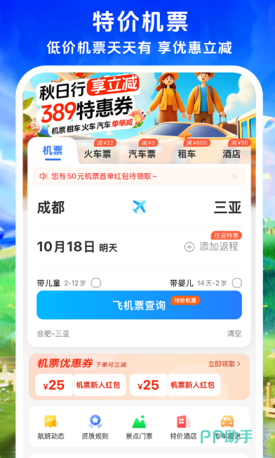 众多特价机票等你来选择,只要输入起点及终点,就能在线一键查询,各种特价机票及便捷的出行方式可一目了然,看到还能直接在线预订。进行全新改版之后,各种福利优惠可一目了然查询,自动立减下单时更加划算。还有首单优惠模式,如果是第1次使用或者是新用户,可享受较低折扣,除了购买飞机票之外,也能租车购买火车票。
