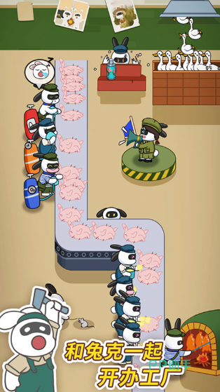 在这个游戏里玩家将扮演一位带领一群超萌兔克小伙伴的工厂老板,要在自己的工厂里,亲手搭建起一条条神奇的流水线,生产那些让人怀念的老产品。而且,游戏里的画面特别卡通可爱,满满的都是复古风情。玩家得从零开始,先从做烤鸭起家,一点点赚钱,然后升级设备扩大生产。每次完成管理任务,都有丰厚的奖励等着玩家,可以用来解锁更多好玩的玩法。