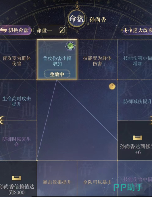 【技能变为群体伤害】该词条是角色主要核心,能够将孙尚香的单体技能变为群攻的技能,是核心命盘中必选的一个词条。毕竟我们都知道孙尚香的技能能够对别人造成210%高额伤害,该效果进化为群攻的时候伤害会大幅度提升。