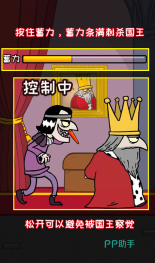 游戏中玩家需设法在不被察觉的情况下刺杀国王,进而取而代之。在游戏中,玩家需要紧跟国王的步伐,轻触屏幕并保持,直至暗杀准备的进度条满载,同时需时刻警惕国王的转身,以免被发现而重归平民生活,重新为进入王宫奋斗,积累必要的财富。提供刺客与国王两大角色供玩家选择,每个角色背后都有着独特的游戏逻辑与乐趣。精心设计的关卡,难度渐进,每一关都是对玩家智慧与反应的新考验。
