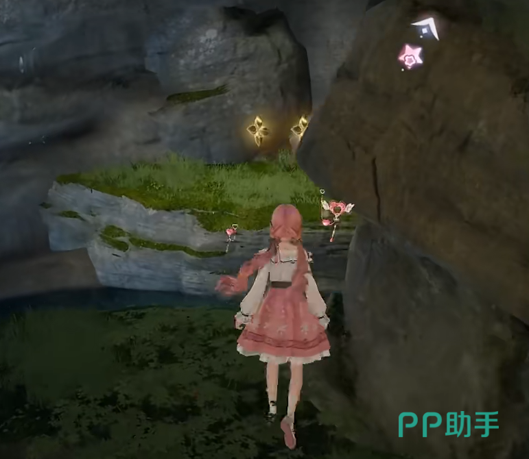 接着从右侧下去,路上可以看到一些材料,可以进行采摘获取。一路往上走能够获得露珠。继续走便可以返回主线。接着跟随噗灵一路前进。在第一个高台的下方会有着3颗露珠,拿完之后我们可以沿着水源一路往前走,走到尽头便可以看到一个宝箱。这个宝箱里面有着不少的钻石,拿完之后大家返回到刚跳下来的位置。之后可以从右边的岩壁回归到主路。
