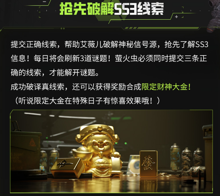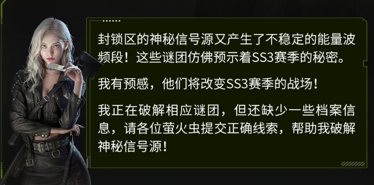 在赛季开始之前,“萤火黑科技研究所”已经开始向外泄露一些神秘的研发线索。艾薇儿等资深探员早已注意到这些信号,并开始着手解密其中的秘密。如果你不想错过第一手资料,不妨前往局内,获取更多的破译线索,揭开SS3赛季中黑科技的面纱。每个线索都可能成为你制胜的关键,让你在战斗中抢占先机。